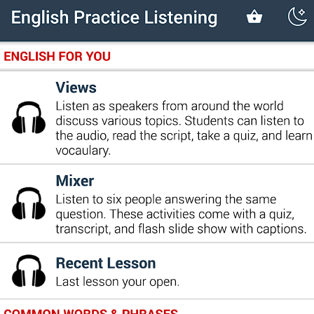 «English Listening & Speaking» es una aplicación gratuita para escuchar inglés y hacer ejercicios de comprensión oral sobre los audios, que llevan transcripción. En esta app todo el contenido se divide por niveles. Puedes comenzar fácilmente tu práctica auditiva del inglés desde el nivel en que te sientas cómodo/a y avanzar hasta un nivel más avanzado. Con escenarios preestablecidos que cubren casi todos los aspectos de la vida cotidiana, pronto notarás que los resultados de la práctica de escuchar inglés afectan muy positivamente a tus habilidades para escuchar y hablar en inglés.