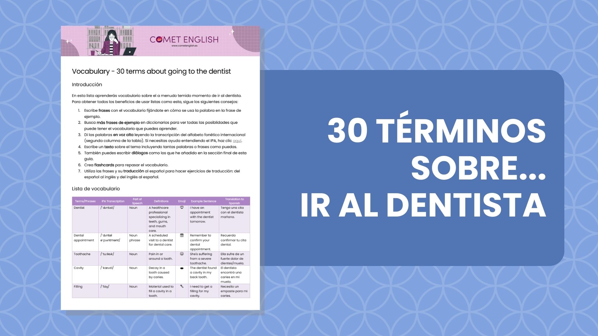 En esta lista aprenderás vocabulario sobre el a menudo temido momento de ir al dentista. Incluye una lista de consejos para obtener todos los beneficios de usar listas como esta, y diálogos en los que se utiliza el vocabulario, además de traducciones al español y frases de ejemplo.